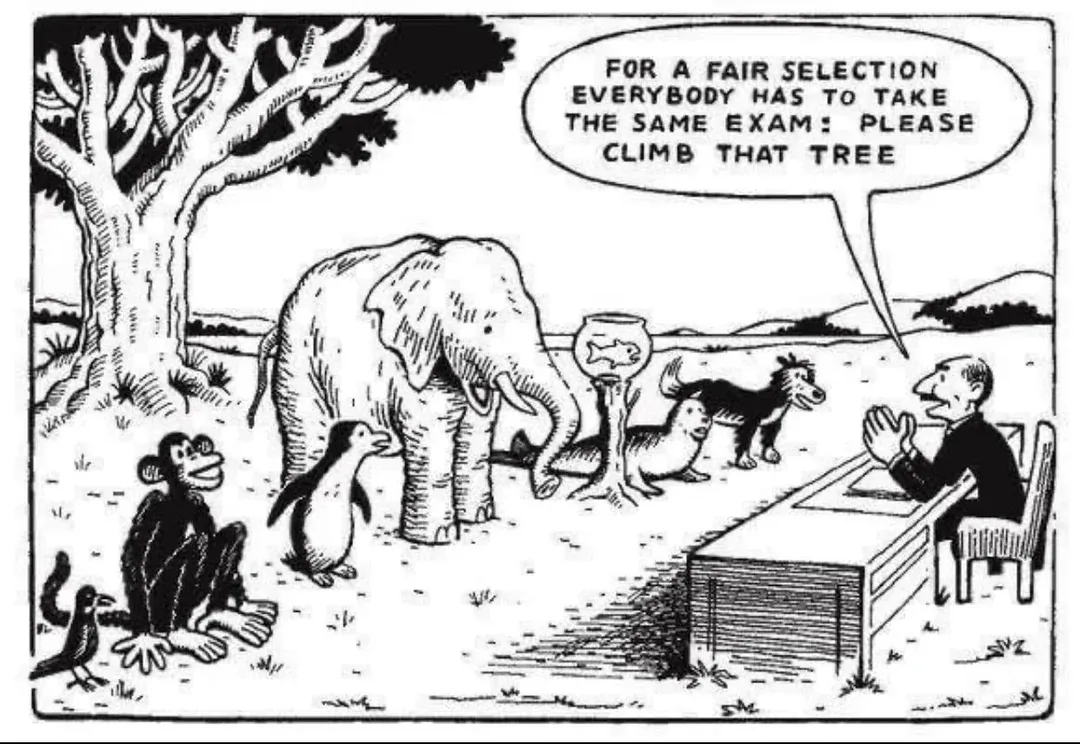 În opinia mea, treaba oricărui sistem electoral este să „producă” niște aleși care sunt reprezentativi, legitimi și competenți. După gustul meu, aș mai fi adăugat să fie și integri, da' asta ar putea intra în contradicție cu reprezentativitatea, motiv pentru care am renunțat. Inspirat de caricatura de mai sus, asemuiesc misiunea sistemului electoral cu capacitatea fiecărui animal de-a se urca în copac. Și-i atribui fiecărui animal din caricatură câte o componentă a procesului electoral: