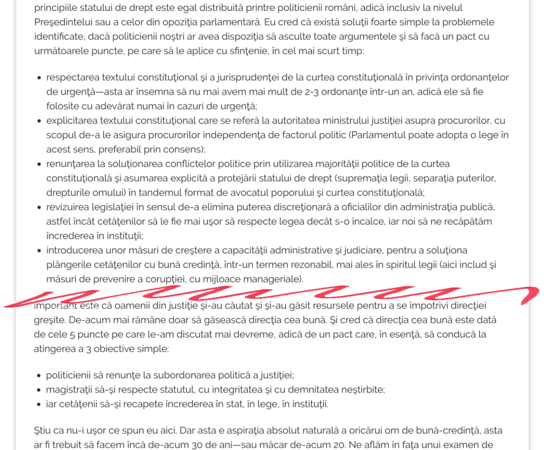 Sugerez că problemele politice trebuie să primească soluţii politice, nu politicianiste, nici populiste. Soluţia politică pe care o văd eu ţine de pactul pe care l-am sugerat în interviul de duminică—5 puncte uşor de înţeles, subordonate faţă de 3 obiective simple (vezi extrasul mai jos). Preşedintele României are un astfel de mandat în art. 80, alin. 2 din Constituţie, aşa că poate invita partidele politice la realizarea unui pact politic pentru buna funcţionare a statului, prin toate autorităţile şi instituţiile sale. Iar adoptarea acestui pact îi poate asigura şi obiectivul politic de-a obţine al doilea mandat, dacă se va dovedi că are capacitatea de-a media şi asigura pacea socială.